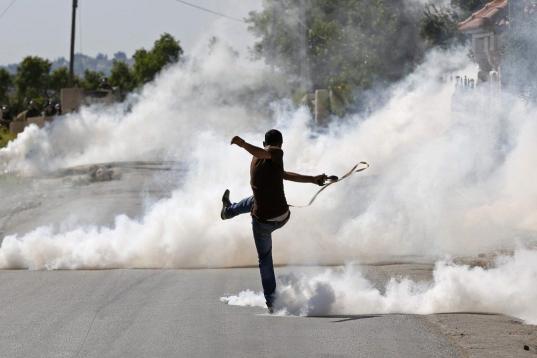 Un manifestante palestino devuelve de una patada una lata de gas lacrimógeno a las tropas israelíes que se la habían lanzado durante una protesta en el asentamiento judío de Ofra, cerca de Ramala.