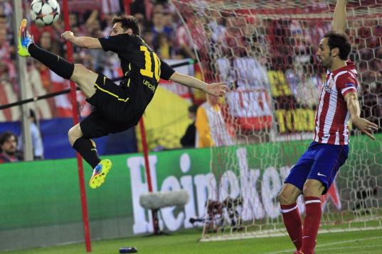 El delantero argentino del F.C Barcelona, Leo Messi, intenta controlar el balón ante Juanfran, del Atlético de Madrid, durante el partido de vuelta de cuartos de final de la Liga de Campeones que se disputó el miércoles en el estadio Vicente...
