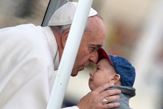 Antes de la tradicional misa matutina de los miércoles, el papa Francisco besó la frente de un niño en la plaza de San Pedro.