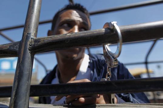 Un refugiado somalí es esposado a una barra de una camioneta tras ser interrogado en una comisaría emplazada en el estadio de Kasarani, Nairobi. La Policía de Kenia detuvo a cerca de 4.000 personas durante la última semana en Nairobi, en una...
