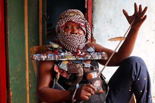 Una mujer enmascarada perteneciente a la milicia cristiana de los antibalaka blande un machete en una terraza de Zawa (República Centroafricana).