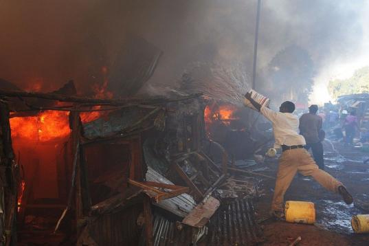 Un grupo de kenianos tratan de apagar un fuego con cubos de agua causado por un fallo eléctrico en una de las viviendas del poblado Deep Sea de los suburbios de Nairobi.