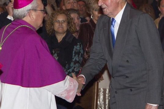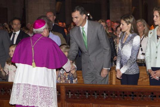 El presidente de Baleares, José Ramón Bauzá, y la presidenta del Consell de Mallorca, María Salom, han recibido a los reyes y a su familia minutos antes del mediodía en el portal principal del templo gótico mallorquín, donde ha oficiado la misa el deán de la catedral de Mallorca, Joan Bauçà.