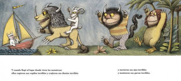 Uno de los aspectos más llamativos del libro es que las ilustraciones van aumentando de tamaño conforme el pequeño deja volar su imaginación. Y todo, porque, como dicen las primeras palabras de Donde viven los monstruos: