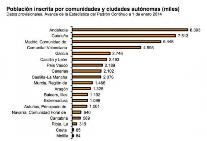 Comunitat Valenciana (–118.599), Andalucía (–47.665) y Comunidad de Madrid (-47.279) registran las mayores reducciones de población en términos absolutos entre el 1 de enero de 2013 y el 1 de enero de 2014. Por su parte, los menores descensos de población corresponden a País Vasco (–2.833 personas), La Rioja (–3.283) y Cantabria (-3.320).