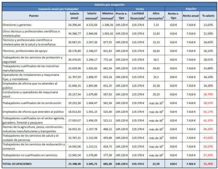 Si se siguen estas pautas, de los 16 colectivos de ocupación establecidos en el Instituto Nacional de Estadística (INE), ocho quedarían fueran del mercado del alquiler y siete del de compra porque no lograrían la financiación.