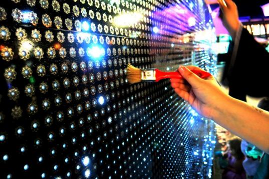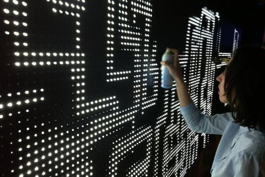 Esta modalidad de grafiti funciona gracias al agua. Al tocar los bordes del LED se crea un puente eléctrico que permite que la corriente fluya y que el LED se ilumine. Cuanta más agua, más intenso es el brillo. (Aquí puedes ver las fotografías del proceso de creación del panel de LED)