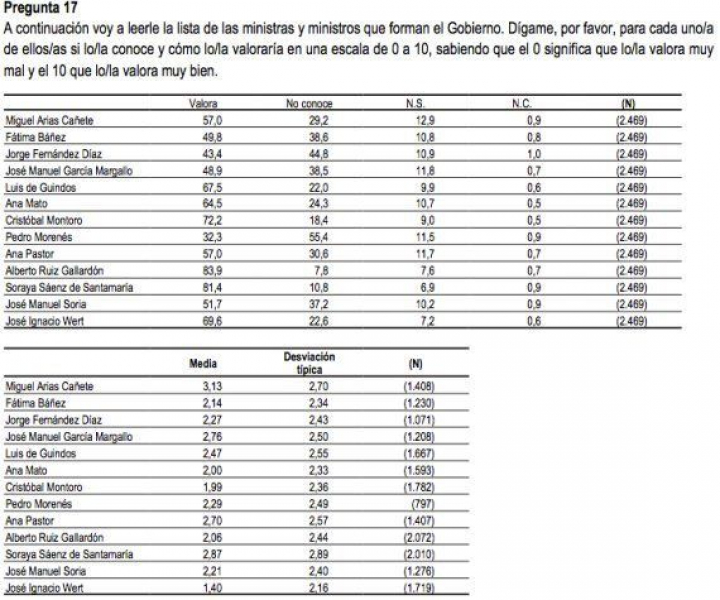 Sin embargo, todos los ministros suspenden y quedan muy por debajo del 3 en la valoración. Los peor valorados son, por este orden, Wert (1,4), Montoro (1,99), Mato (2) y Gallardón (2,06).