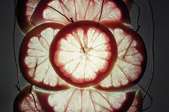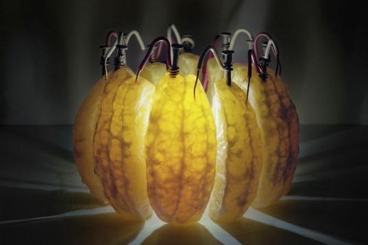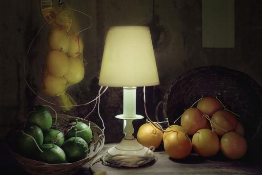 La serie de imágenes Back to Light del fotógrafo Caleb Charland combina ciencia y arte y muestra lámparas iluminadas con la energía de manzanas, naranjas o limones o bien al aire libre o en una especie de modernos bodegones con calaveras incluidas.