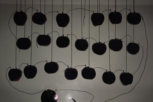 El artista nunca sabe cuántas piezas de fruta va a necesitar para encender una bombilla, ya que cada una contiene una cantidad de energía. Para encender un LED de 3,5 vatios se pueden necesitar diez o veinte manzanas. “Aquí solo funciona la prueba error”, explica.