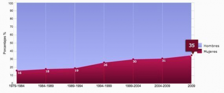 Ese es el porcentaje de mujeres del total de eurodiputados. En la actualidad, España supera la media, con 21 mujeres y un porcentaje de casi un 39%. La proporción de mujeres en la Eurocámara es sensiblemente mayor a la que se puede encontrar en la Comisión Europea o el Consejo Europeo.