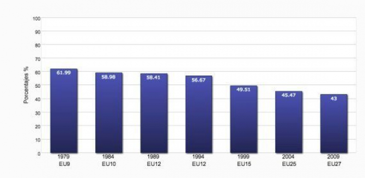 La tendencia no es halagüeña. Desde 1979, cuando fue del 61%, la participación ha descendido sin parar. En España lleva descendiendo desde el 1999, cuando era del 44,9%.
