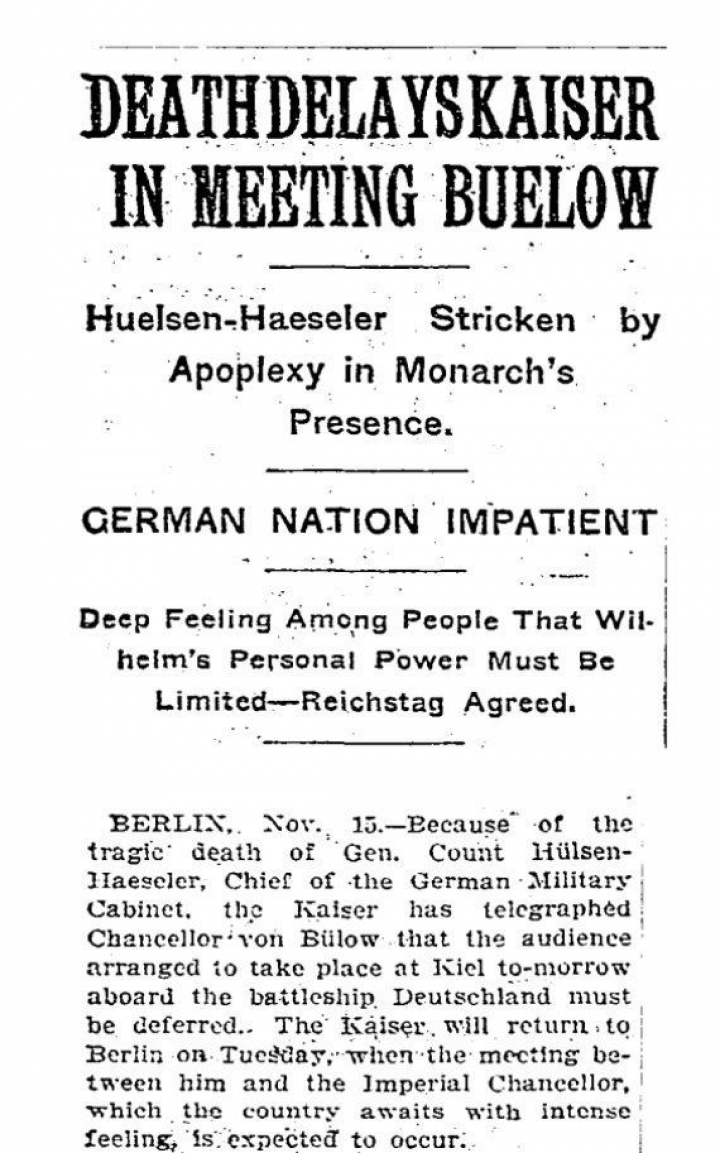 Pese a contar con una brillante hoja de servicios en su carrera militar por y para Alemania, la vida del general Dietrich von Hülsen-Häseler, jefe del gabinete militar del kaiser Guillermo II, ha quedado reducida a una breve nota en los libros que analizan los motivos que propiciaron el estallido de la Primera Guerra Mundial (1914-19818).