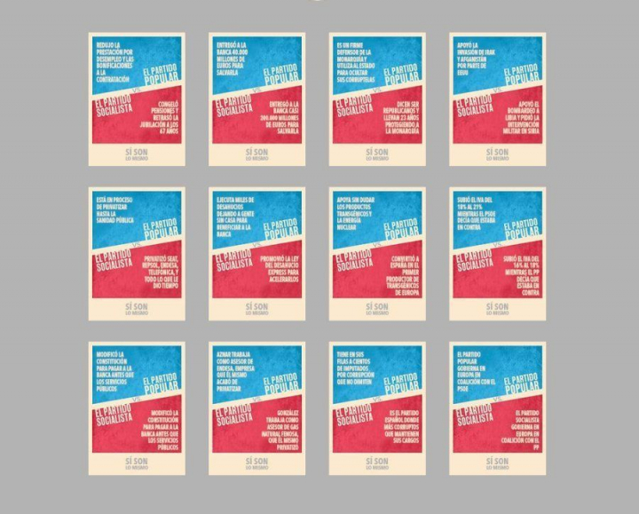 Pero hay más. A la guerra de carteles de PP y PSOE se ha sumado la web laRepública.es, que ha creado la web "sí son lo mismo" y en la que, imitando la estética de la de los socialistas, se pueden ver carteles con los que se intenta demostrar que las políticas de ambos partidos son muy similares.