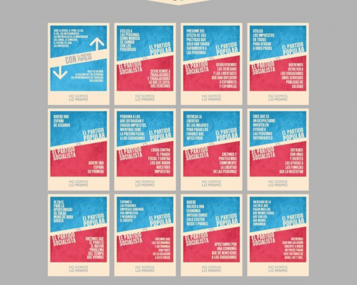 Mediante una serie de carteles, contraponen las ideas de cada partido utilizando los colores rojo y azul. "El PP utiliza a las personas como moneda de cambio con los poderosos, el PSOE devuelve a los trabajadores lo que es suyo: sus derechos” o “El PP celebra los beneficios de sus amigos a cuenta del dinero de todos, los socialistas queremos recuperar para los ciudadanos lo prestado a los ricos”, son algunos de los ejemplos.