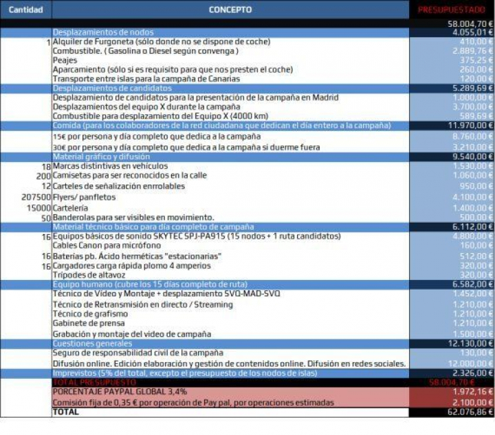 El presupuesto para la campaña de las europeas es de 62.076,86 euros. Hasta el momento, ya han conseguido financiar más del 80% de lo previsto con una recaudación que supera los 50.000 euros. “Somos los que llevamos más el crowdfunding en el ADN”, apostilla Levi, que explica que a través de este método han recaudado unos 80.000 euros desde que se inició la actividad de partido hace un año y medio.