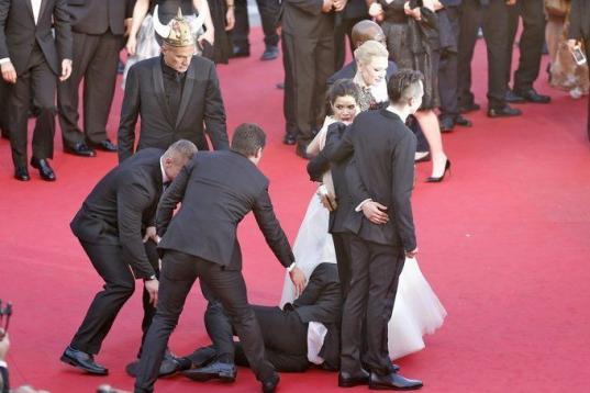 La identidad del hombre no ha sido confirmada, pero varios medios aseguran que se trata de Vitalli Sediuk, ucraniano conocido por este tipo de actuaciones. Por ejemplo, intentó besar a Will Smith en Londres mientras promocionaba Men In Black III en 2013, lo que le costó una bofetada.