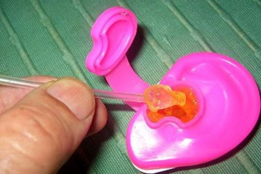 Pese a que el recipiente es una oreja de plástico y la forma de comerla es empleando un palillo de plástico, el sabor de esta gelatina no se parece al de la cera de los oídos. Tranquilos, sabe a naranja.