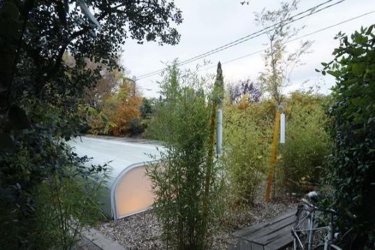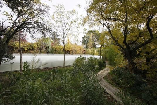 El espacio, diseñado por sus propietarios, fue construido en 2008 en una finca llena de acacias, encinas, chopos, mimosas, prunos y perales, entre otros especies. "Gracias a no luchar en contra de nuestro entorno sino a adaptarnos a él, sólo recurrimos a la calefacción en los días de invierno", continúan. El lugar tiene otras plantas como glicinias, rosales, madreslvas, bambús, violetas y romero: "Es lo que aporta la naturalidad ".