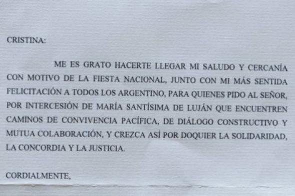 "Cristina: me es grato hacerte llegar mi saludo y cercanía con motivo de la fiesta nacional, junto con mi más sentida felicitación a todos los argentinos, para quienes pido al Señor, por intercesión de María Santísima de Luján, que encuentren caminos de convivencia pacífica, de diálogo constructivo y mutua colaboración, y crezca así por doquier la solidaridad, la concordia y la justicia", se lee en la carta difundida por el Gobierno argentino.