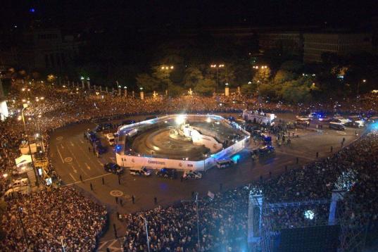 Ni un alfiler cabía en los alrededores de Cibeles para poder festejar el título conquistado por los de Carlo Ancelotti en la prórroga ante el Atlético de Madrid. El tiempo extra en Lisboa fue el primer inconveniente para que la celebración no se retrasase en exceso, desafiando el 'toque de queda' que estableció la Junta Electoral Provincial.