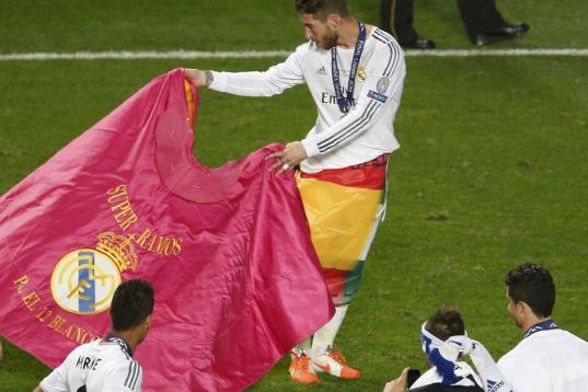 Después de unos cortos y eufóricos parlamentos, Casillas y Ramos se dispusieron a coronar la diosa, utilizando una escalera situada a la espalda de la estatua para llegar a lo más alto. Ahí, Casillas cedió el honor a su compañero, héroe de la 'Décima' y capitán en funciones durante todo el año, de enfundar Cibeles con las banderas del Madrid. Ramos levantó al cielo la 'orejona' y después llamó a Iker para juntos brindar la copa a todos los aficionados.