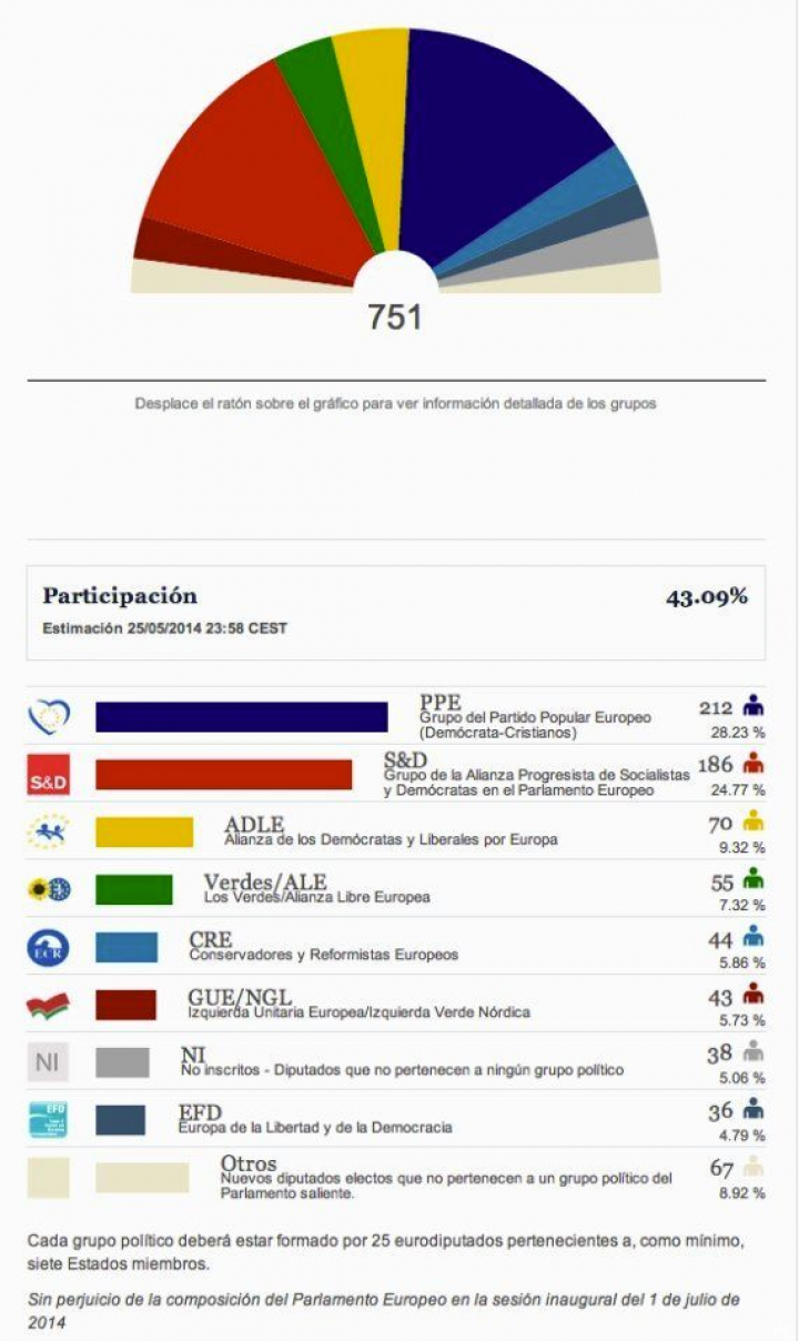 La participación se ha quedado en el 43,09% en el conjunto de la Unión, nueve centésimas más que en 2009. En España fue del 45,84%, casi un punto más que en 2009. Es la primera vez desde 1979 que la participación resiste e incluso repunta un poco, algo que a última hora de este domingo el Parlamento Europeo reivindicaba como un éxito propio pero que probablemente se deba al entusiasmo de los partidos que quieren dinamitar desde dentro los cimientos de la UE.