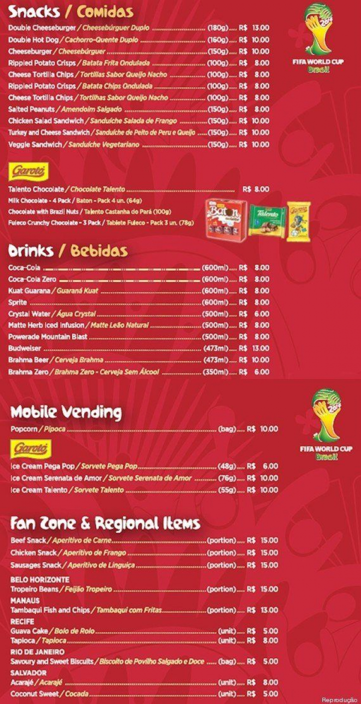 Cauê Marques, redactor de economía del Brasil Post, explica que desde la perspectiva brasileña son precios bastante elevados y poco asequibles: vuelve a repetirse lo que ya ocurriera en la Copa Confederaciones. Así, habrá que pagar 21 reales brasileños (casi 7 euros) por una comida compuesta de una doble cheeseburguer de 180 gramos y un refresco de 600 ml. El precio no difiere demasiado del que pagarías en una cadena de comida rápida en España, donde un menú así costaría alrededor de 5 euros.