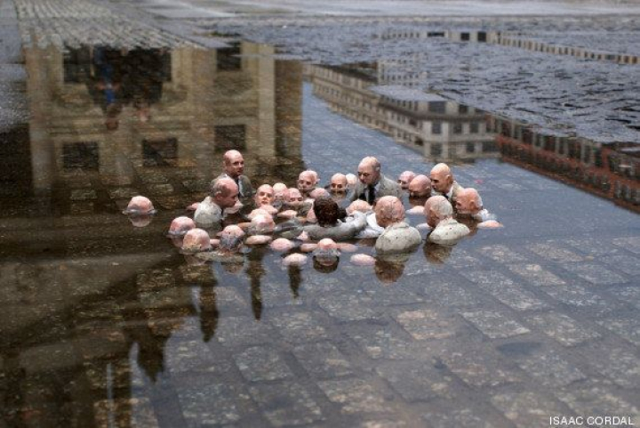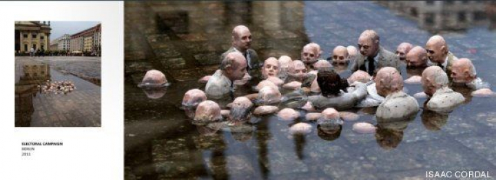 Aunque en redes sociales se ha rebautizado la imagen como Políticos discutiendo el calentamiento global, esta obra se titula Campaña electoral. "Es una instalación del 2011 realizada en Berlín, en la plaza Gendarmarkt. Es una crítica en general a la clase política que hunde todo lo que toca", señala el artista Isaac Cordal (Pontevedra, 1974). "Esta intervención era efímera. Buscaba un gran charco en un espacio abierto. Y allí estaba. Follow the leaders son una serie de intervenciones con figuras de pequeño tamaño, normalmente realizadas en cemento, que representan hombres de negocios o políticos en situaciones absurdas a lo largo del espacio urbano", dice.