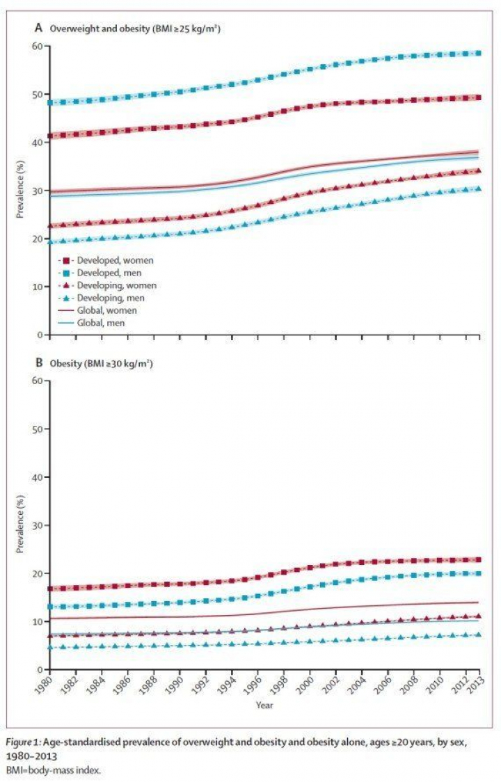 El trabajo muestra que en los últimos 30 años, el número de personas con un exceso de kilos no ha dejado de aumentar. Si en 1980, había 857 millones de humanos con sobrepeso u obesidad, en 2013 se superó la cifra de los 2.100 millones. Con datos procedentes de unos 2.000 estudios e informes, los investigadores han podido crear el mapa de la gordura mundial (accede aquí al mapa interactivo).