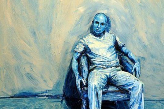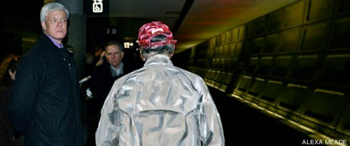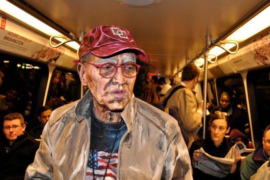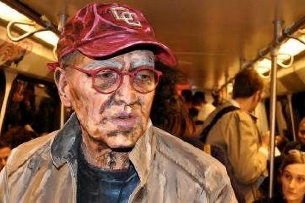 Si miras la foto de arriba, no te jugarías mil euros a que se trata de un hombre real. Podría ser un cartel de cartón colocado en mitad de un vagón de metro como parte de una performance. O un anciano con el cuerpo embadurnado en pintura que simula ser un cuadro realista.