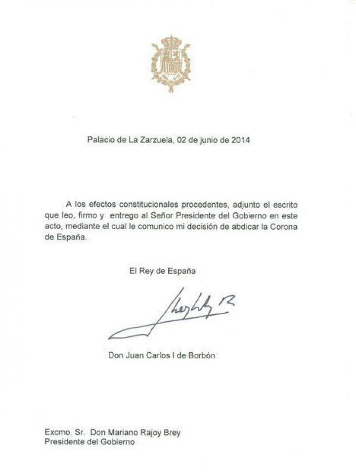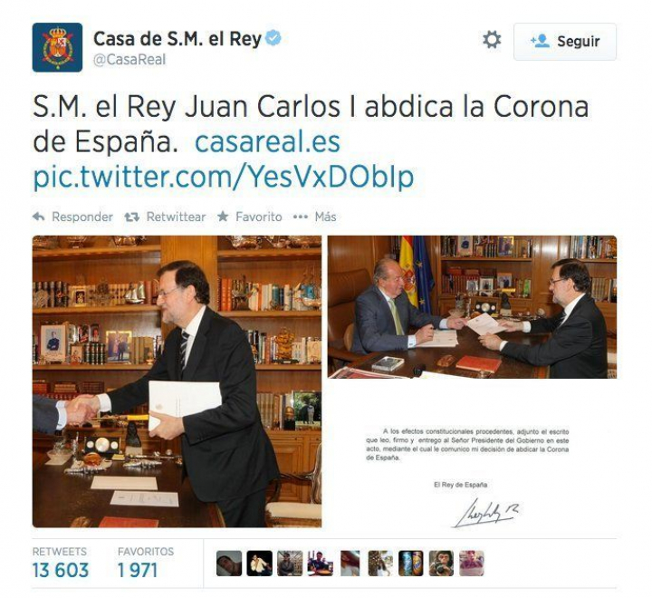 La Casa Real ha anunciado en Twitter la abdicación del rey y ha colgado el documento en el que el monarca comunica que deja el trono, acompañado de dos fotografías de Juan Carlos I con el presidente del Gobierno, Mariano Rajoy.