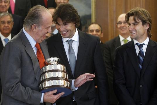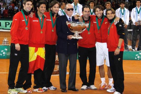 Meses después les recibió en la Zarzuela. En la foto, junto a Rafa Nadal y David Ferrer.