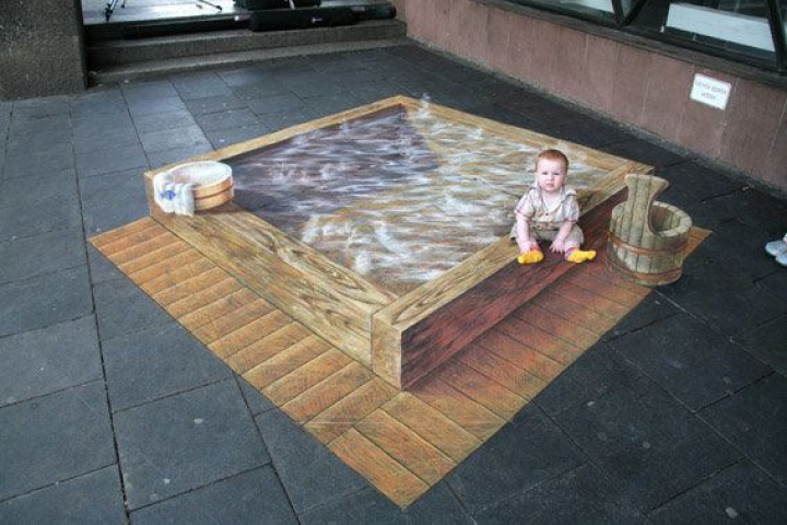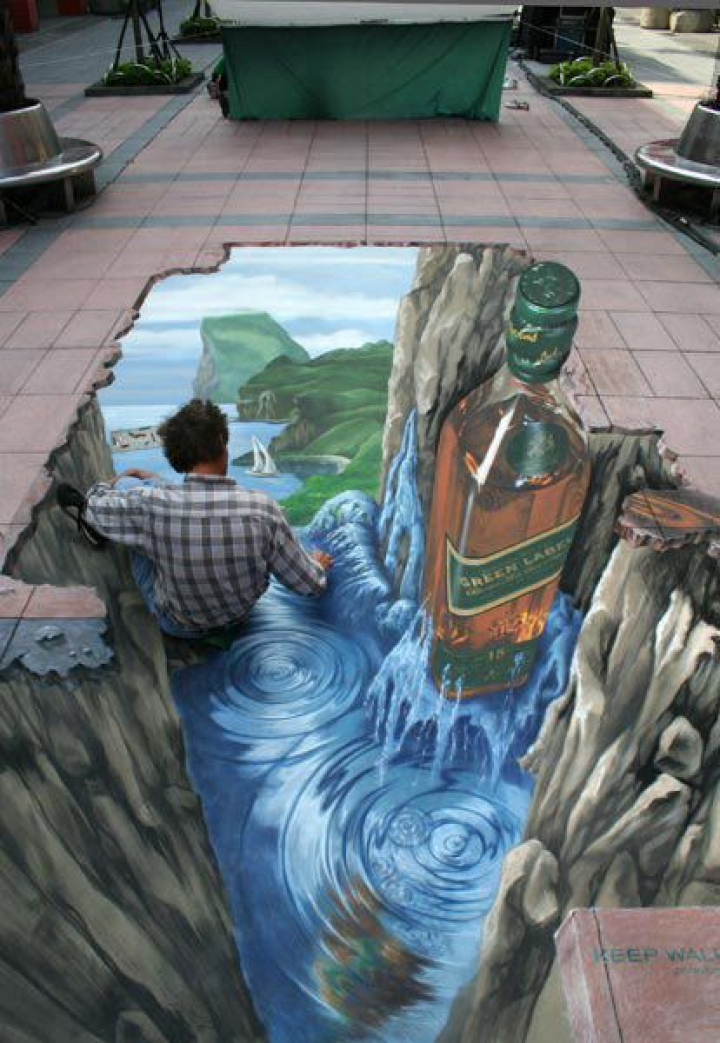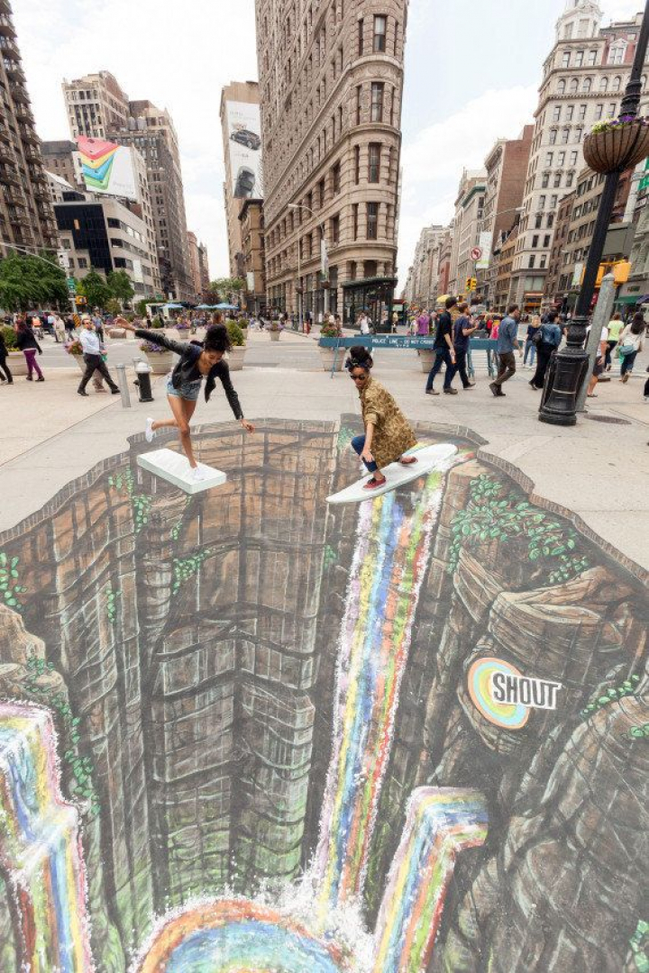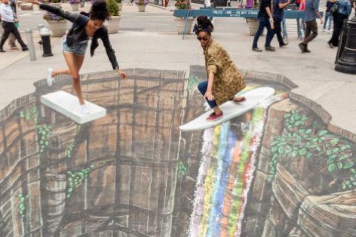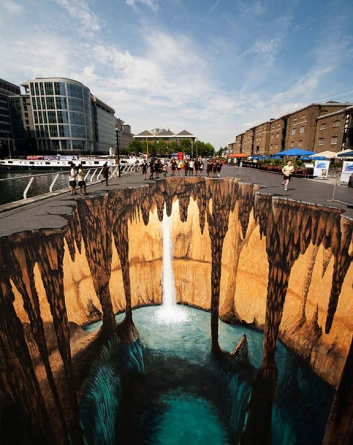 Hay pocas cosas tan divertidas como ir andando por la calle y encontrar en medio de una plaza una enorme cascada con arco iris incluido. Para conseguir hacer realidad este extraño fenómeno, puedes probar con alguna sustancia alucinógena o tropezar con un tesoro visual como es el arte de la tiza en tres dimensiones.