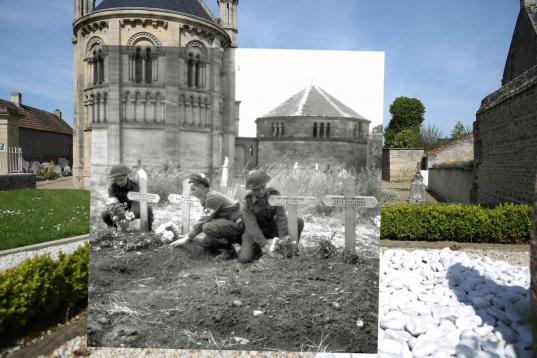 Una vista del cementerio con la iglesia de Saint-Georges-de Basly. En la imagen antigua, las fosas de dos civiles franceses, un soldado escocés y otro canadiense.