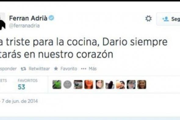 Otro de sus colegas en Madrid, Sergi Arola (Sergi Arola Gastro) ha asegurado en Twitter: "Estoy en estado de shock, no tengo palabras, no doy crédito, no puedo dar crédito. Es demasiado duro esto Darío, por qué???"