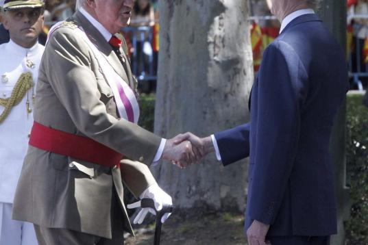 Luego, el rey se ha despedido de los militares con una recepción ofrecida en el Palacio Real. "Vamos a brindar por el primer soldado y el primer marino de España. Por su majestad el rey", ha dicho el ministro Morenés, a lo que don Juan Carlos ha contestado, también levantando su copa: "Brindad conmigo: ¡Por España!".