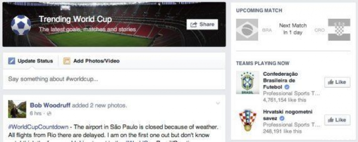 Por su parte, Facebook ha elaborado para el Mundial una página llamada Trending World Cup (Lo Más Popular del Mundial) en la que aparecerán todas las publicaciones que contengan la etiqueta #WorldCup o #CopaMundial.