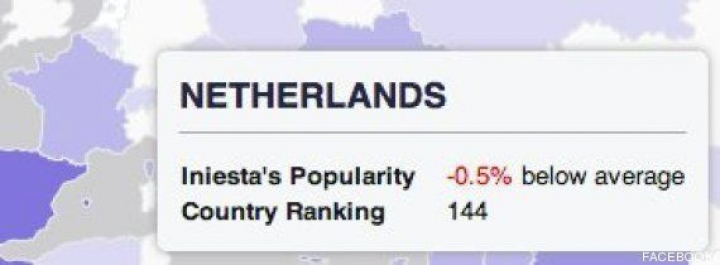 El autor del gol que dio a España su primer Mundial tiene a su país como el primero entre los que más le siguen. En Holanda, país al que le metió aquel gol, no le quieren tanto y se sitúa en el puesto 144.