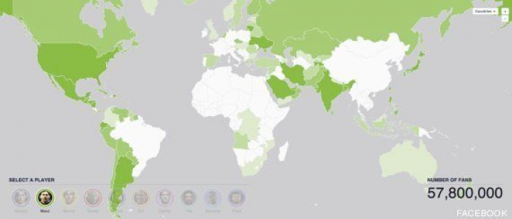 Facebook ha elaborado un mapa interactivo en el que se puede ver cómo están distribuidos los seguidores en Facebook de las principales estrellas del Mundial en función de la población de cada país.