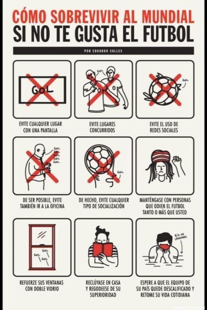 En ella, da ideas sobre cómo sobrevivir al próximo mes, lleno de partidos del Mundial, si no te gusta el fútbol. La tarea, según el ilustrador, no es fácil: tienes que evitar cualquier lugar con pantallas, las redes sociales, cualquier tipo de socialización... dado que el fútbol lo inunda todo.