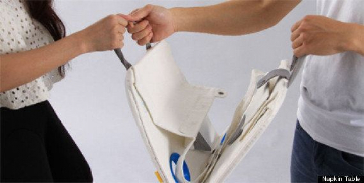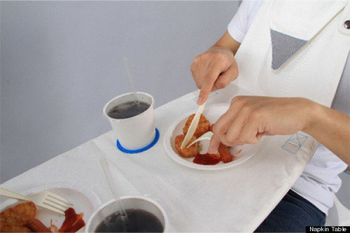 Para usar la ‘Napkin-Table’ hacen falta dos personas, que irremediablemente se mirarán de frente durante toda la comida al sujetar la bandeja con su cuello (como se puede ver en la foto). Para mayor comodidad, disponen de bolsillos laterales para guardar las servilletas y de dos huecos para colocar la bebida.