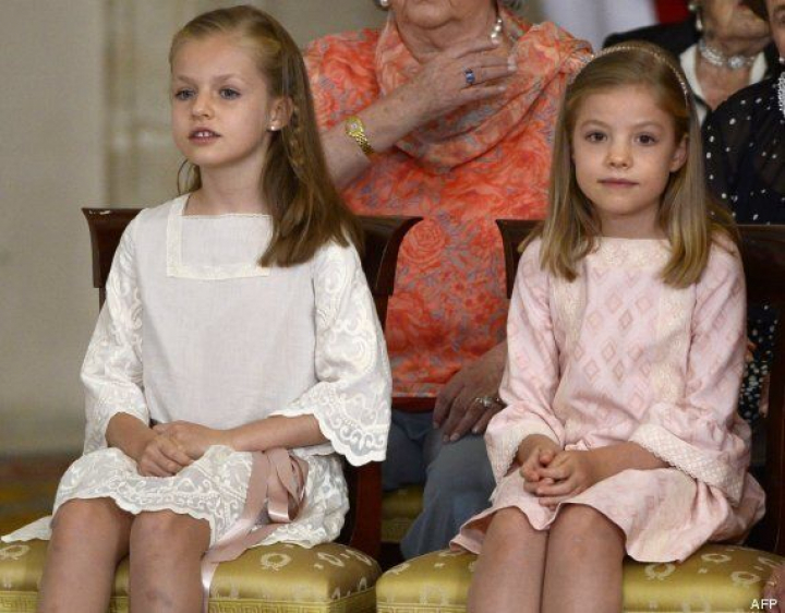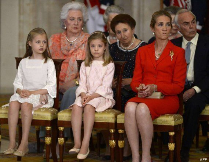 Para tener 8 y 7 años, las niñas se han portado más que bien: sentadas, sin hablar ni preguntar y atentas a lo que pasaba a su alrededor. Como niñeras tenían a su tía, la infanta Elena, sentada junto a ellas, y también a sus tías abuelas las infantas Pilar y Margaritas, hermanas del rey, que se han situado justo detrás. Sin embargo, la princesa de Asturias no ha parado de hacerles gestos y darles discretas indicaciones. Por ejemplo, les ha indicado con las manos que juntaran las piernas ya que Sofía, la más pequeña de las dos, no ha parado de balancearlas en la silla.