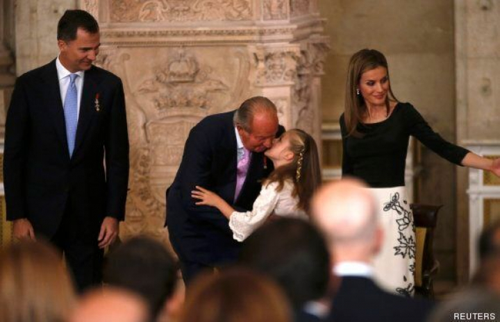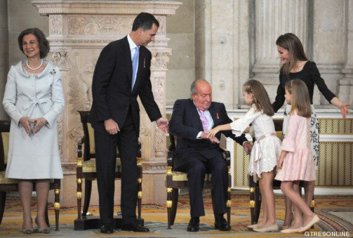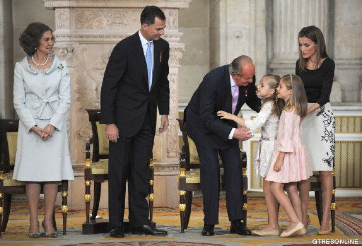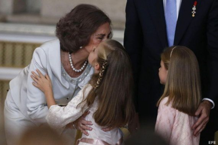 Al final del acto tanto Leonor, que pronto se convertirá en heredera, como Sofía se han acercado a besar a su abuelo (previas indicaciones de su madre). El rey, que estaba de pie de forma inestable, se ha caído sobre la silla cuando Leonor le ha besado, para incorporarse poco después otra vez y besar a sus nietas. Y luego Letizia les ha indicado que volvieran a sus asientos con un suave "muy bien".