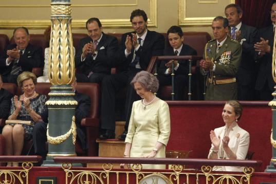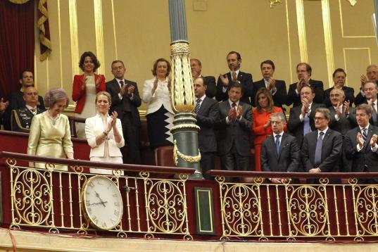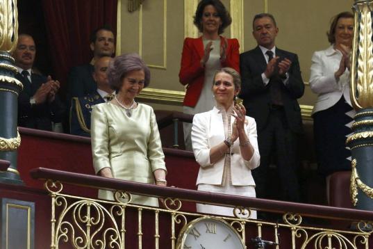Acompañada de la infanta Elena recibió un prolongado aplauso de los asistentes al acto.