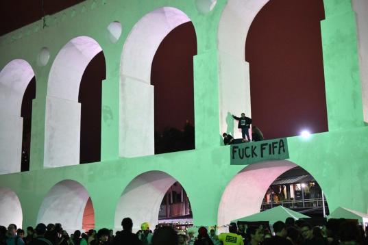 Manifestantes cuelgan una pancarta en un puente en Río de Janeiro (YASUYOSHI CHIBA/AFP/Getty Images)