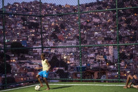 Un joven juega al fútbol en Río de Janeiro (AFP PHOTO / YASUYOSHI CHIBA)