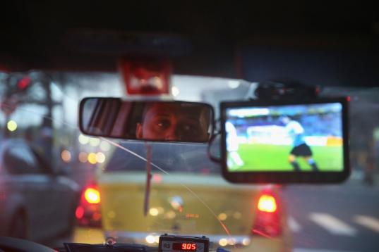 Un taxista observa el Uruguay-Costa Rica en una pequeña televisión mientras conduce (Photo by Joe Raedle/Getty Images)