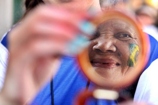 Un mujer se mira al espejo tras ser maquillada con los colores de Brasil (JEWEL SAMAD/AFP/Getty Images)