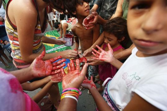 Niños se pintan las manos de rojo antes de una protesta contra el Mundial. (Photo by Mario Tama/Getty Images)